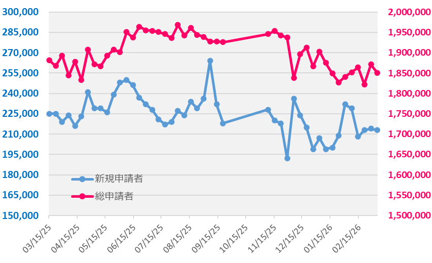 2/29~3/7の新規申請者数:約21.3万人 (前回:21.4万人)
